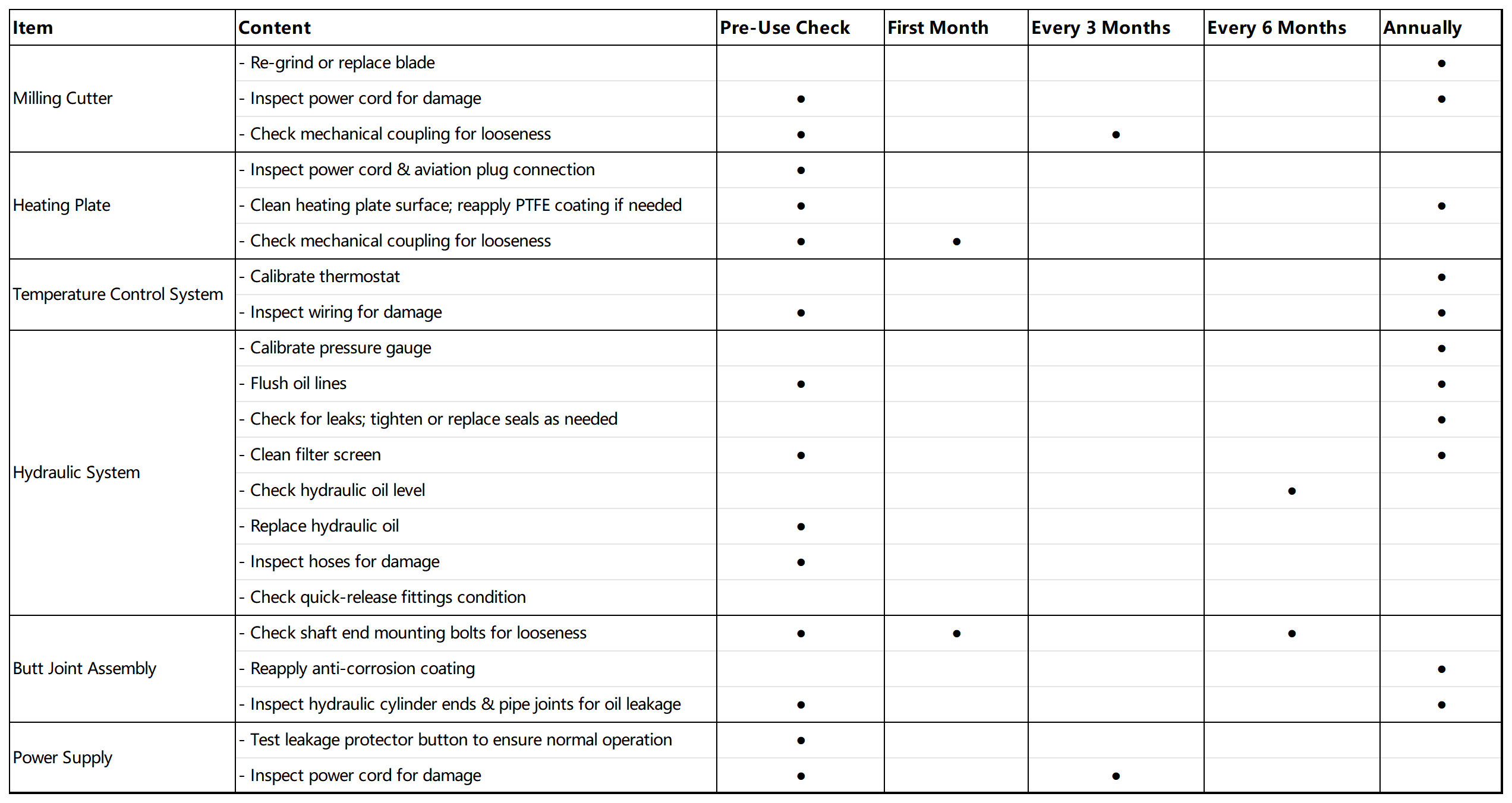 Note: ● — Indicates the corresponding maintenance time for the item.