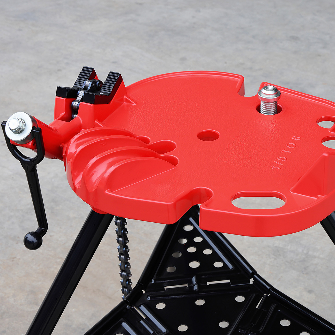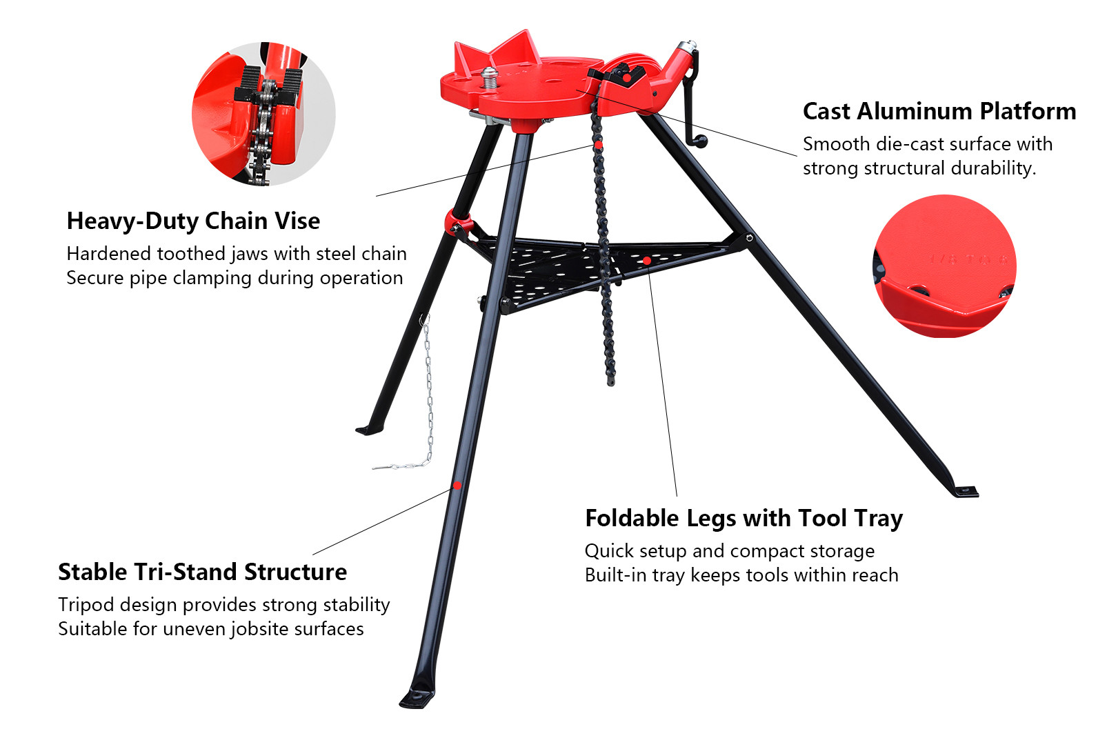 Its stable tripod structure, heavy-duty chain vise mechanism, and foldable legs make it a reliable support tool for jobsite and workshop applications.