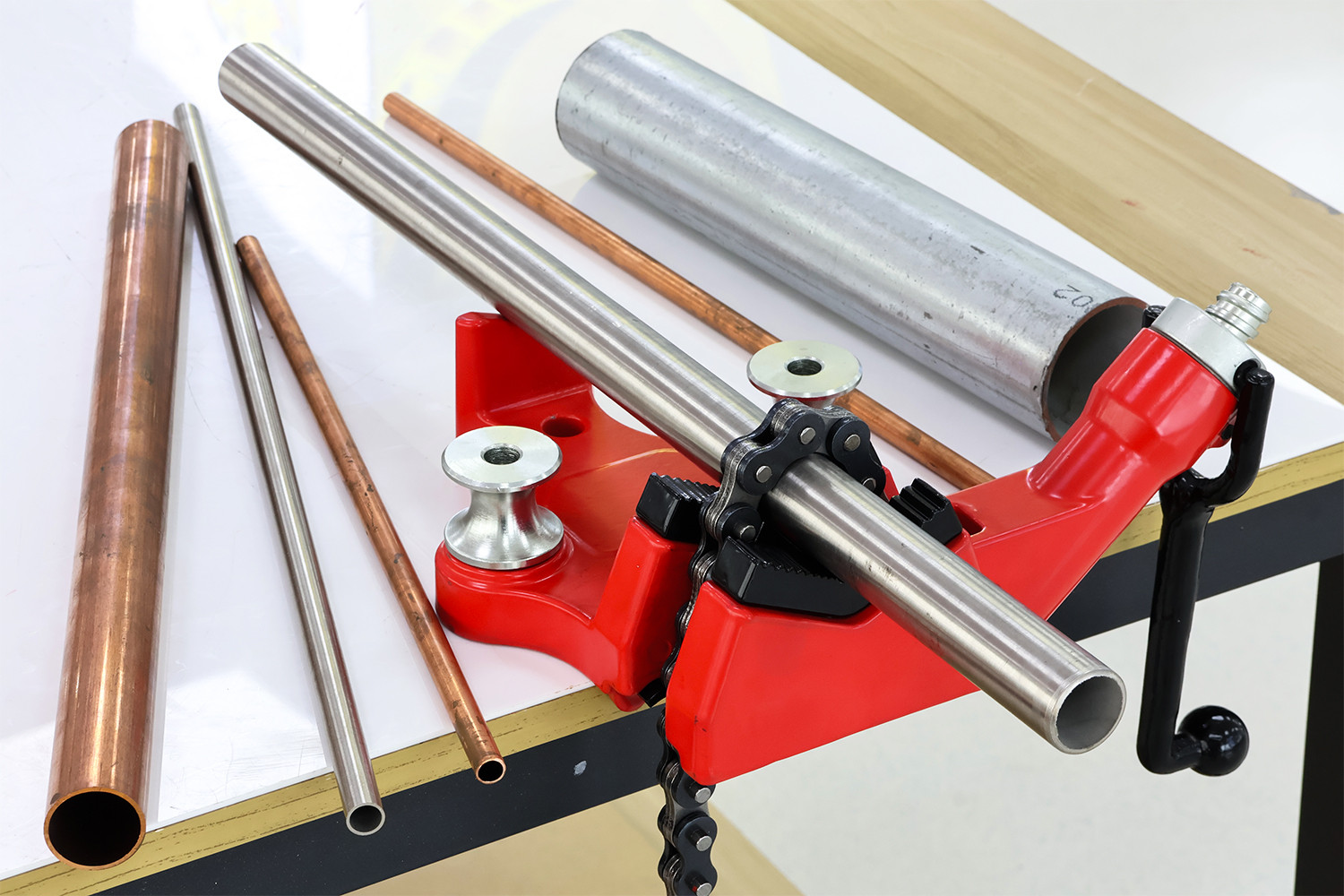 Equipped with hardened toothed jaws and a strong steel chain, the vise ensures reliable pipe clamping and secure operation. The integrated pipe support rollers and built-in pipe bender provide additional convenience during pipe handling and adjustment.
